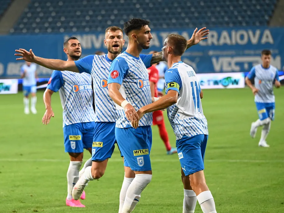 Bucurie a fotbalistilor craioveni dupa un gol marcat cu Andrei Virgil Ivan si Nicusor Silviu Bancu in meciul de fotbal dintre Universitatea Craiova si FC Hermannstadt, contand pentru Superliga Superbet, desfasurat pe Stadionul Ion Oblemenco din Craiova, vineri 4 august 2023. © FOTO:Razvan Pasarica/SPORT PICTURES