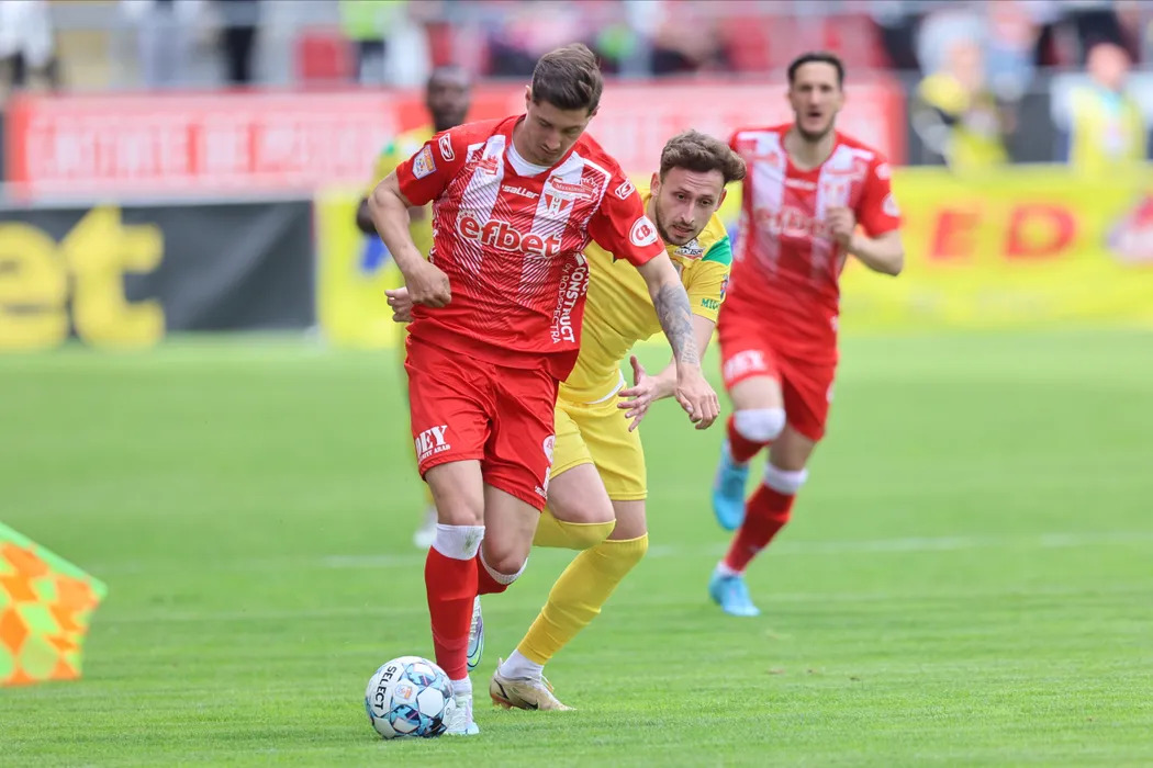 David Miculescu, de la UTA, suteaza in meciul de fotbal dintre UTA Arad si CS Mioveni din etapa a opta a play-out-ului Ligii 1, disputat pe Arena Francisc Neuman din Arad, sambata, 07 mai 2022. CIPRIAN PETCUT / MEDIAFAX FOTO