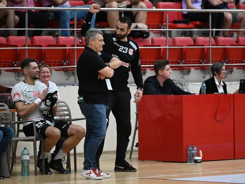 Xavier Fuertes Pascual si Robert Mihai Militaru il felicita pe Saeid Heidarirad dupa doua suturi consecutive aparate in meciul de handbal masculin dintre Dinamo Bucuresti si Steaua Bucuresti, contand pentru Liga Zimbrilor, desfasurat in Sala Dinamo din Bucuresti, vineri 6 octombrie 2023. © FOTO:Razvan Pasarica/SPORT PICTURES