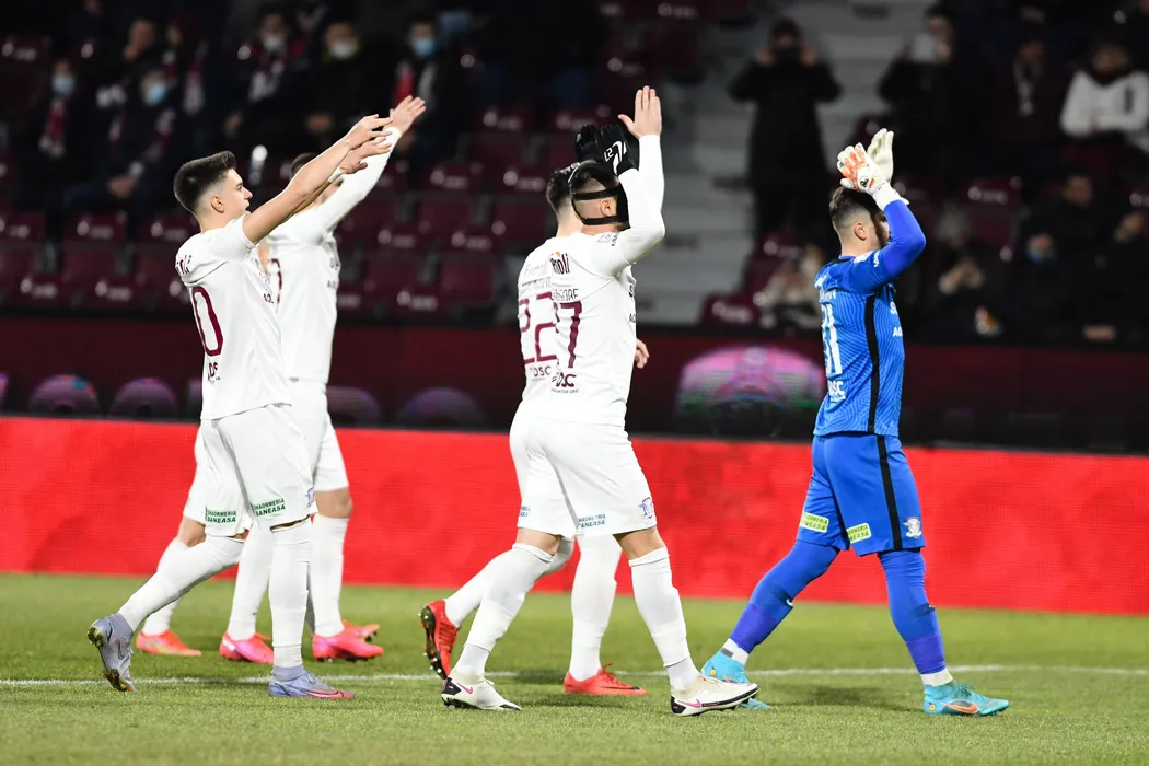 Jucatorii formatiei Rapid reactioneaza in timpul meciului de fotbal contra echipei CFR Cluj din etapa a XXVII - a a Ligii 1, disputat pe stadionul Dr. Constantin Radulescu, duminica, 20 februarie 2022. FLAVIU BUBOI / MEDIAFAX FOTO