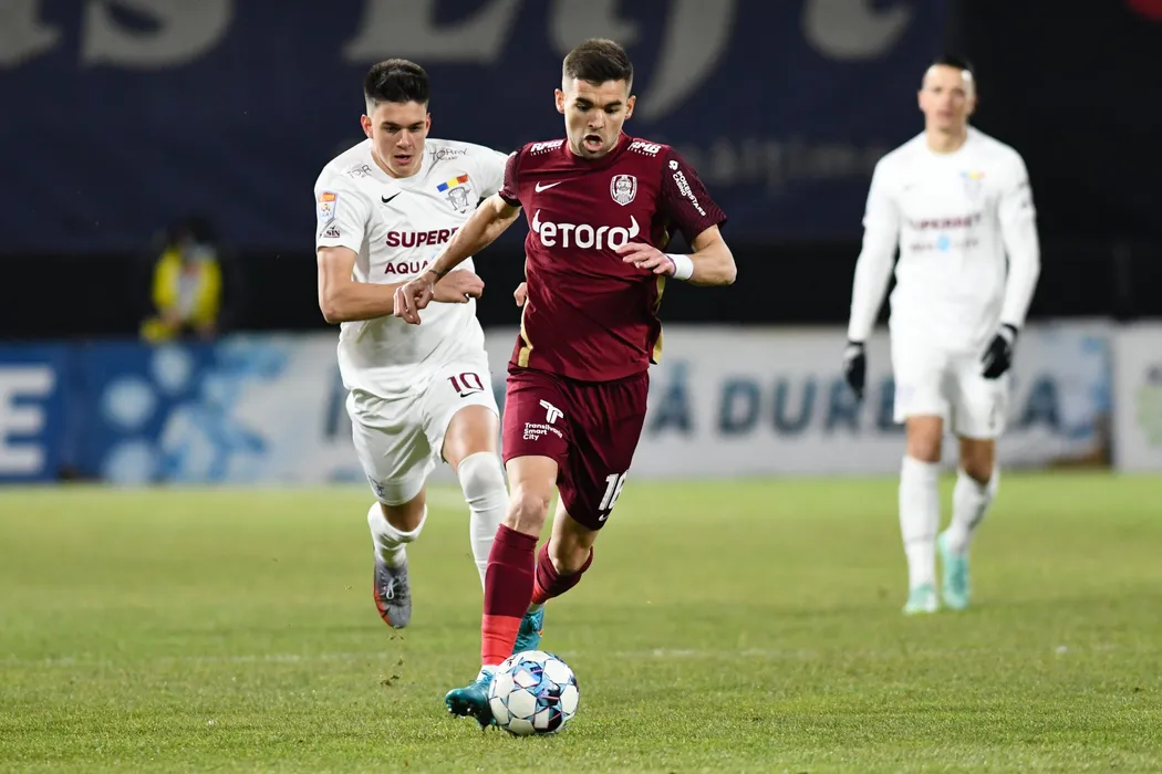 Mateo Susic (C), de la CFR Cluj, suteaza in timpul meciului de fotbal contra echipei Rapid din etapa a XXVII - a a Ligii 1, disputat pe stadionul Dr. Constantin Radulescu, duminica, 20 februarie 2022. FLAVIU BUBOI / MEDIAFAX FOTO