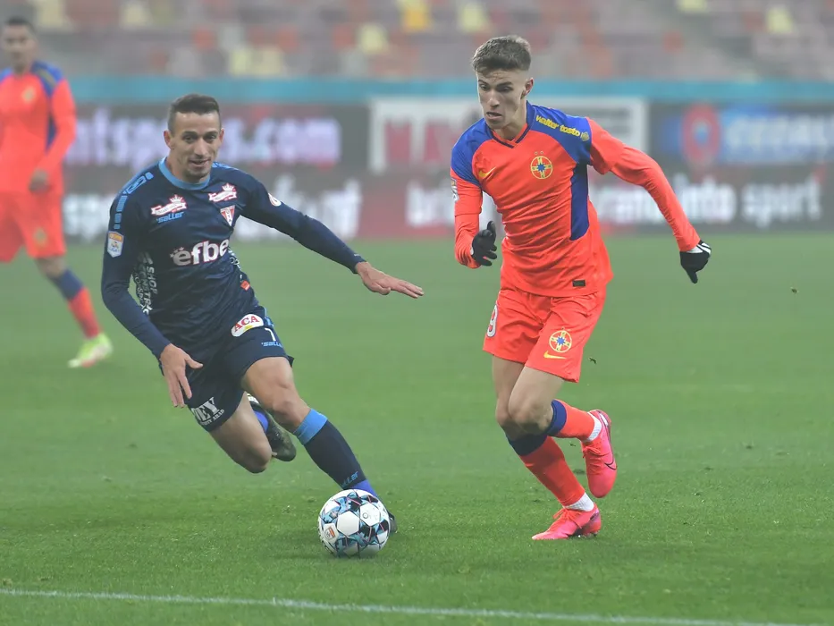 Roger Junio Rodrigues Figueira si Octavian George Popescu la faza acordarii unui penalty in meciul de fotbal dintre FCSB si UTA Arad, contand pentru Liga 1 Casa Pariurilor, desfasurat pe Arena Nationala din Bucuresti, duminica 5 decembrie 2021. © FOTO:Razvan Pasarica/SPORT PICTURES