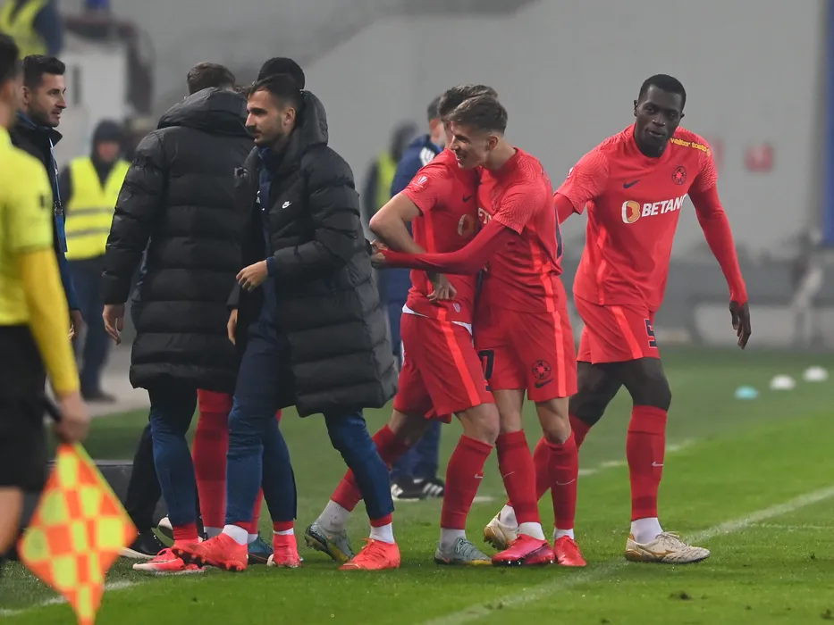 Bucurie a fotbalistilor stelisti dupa un gol marcat cu Boban Nikolov, Octavian George Popescu si Joyskim Aurelien Dawa Tchakonte in meciul de fotbal dintre FC U Craiova si FCSB, contand pentru Superliga Superbet, desfasurat pe Stadionul Ion Oblemenco din Craiova, duminica 13 noiembrie 2022. © FOTO:Razvan Pasarica/SPORT PICTURES