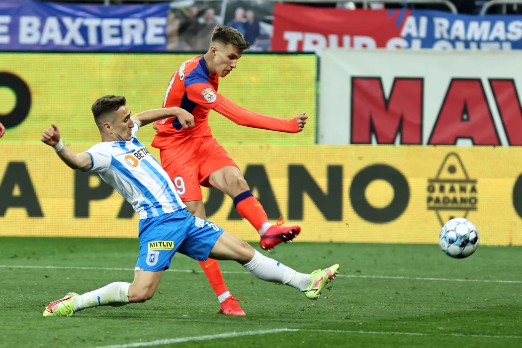Octavian Popescu (D), de la FCSB, lupta pentru balon cu Bogdan Vatajelu(S), de la Universitatea Craiova, in meciul de fotbal din etapa 3 a play-off-ului Ligii 1, disputat pe Arena Nationala din Bucuresti, duminica, 3 aprilie 2022. GEORGE FILIP / MEDIAFAX FOTO