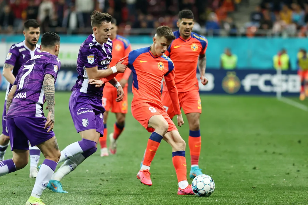 Octavian Popescu, de la FCSB, suteaza in timpul meciului de fotbal contra echipei FC Arges din etapa a 7- a a play-off-ului Ligii 1, disputat pe Arena Nationala din Bucuresti, luni, 2 mai 2022. GEORGE FILIP / MEDIAFAX FOTO