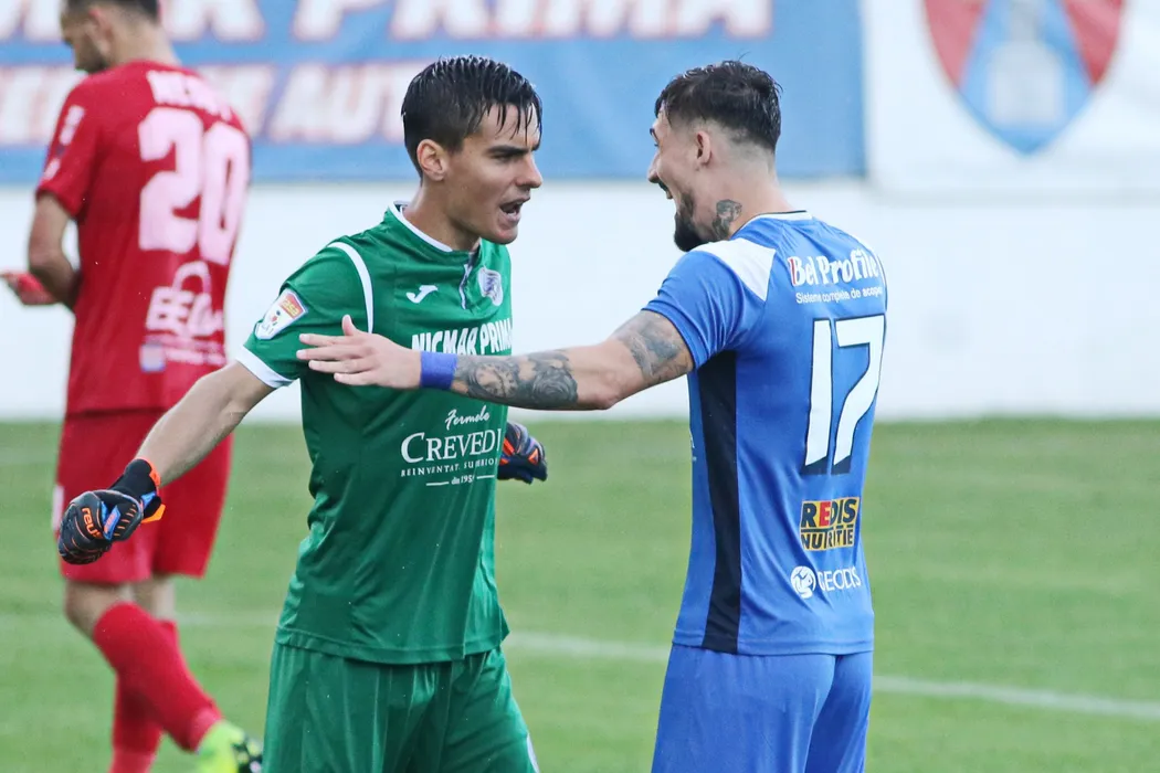 Octavian Valceanu (S) si Alexandru Albu (D), de la Academica Clinceni, reactioneaza la finalul meciului de fotbal contra echipei Chindia Targoviste din etapa a V-a a play-out-ului Ligii 1, disputat pe stadionul Clinceni din Clinceni, luni, 22 iunie 2020. GEORGE FILIP/ MEDIAFAX FOTO