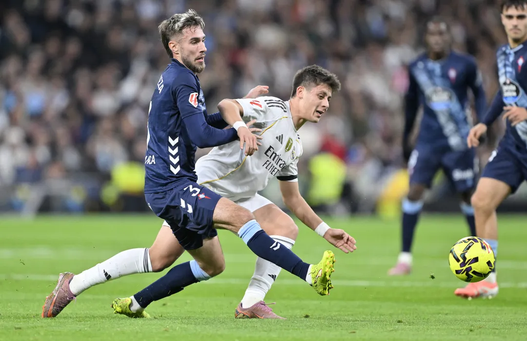 MADRID, SPAIN - DECEMBER 7: Real Madrid’s Arda Guler (R) competes against Celta Vigo’s Oscar Mingueza (L) during the La Liga week 15 match at Santiago Bernabeu Stadium in Madrid, Spain, on December 7, 2025. Burak Akbulut / Anadolu/ABACAPRESS.COM