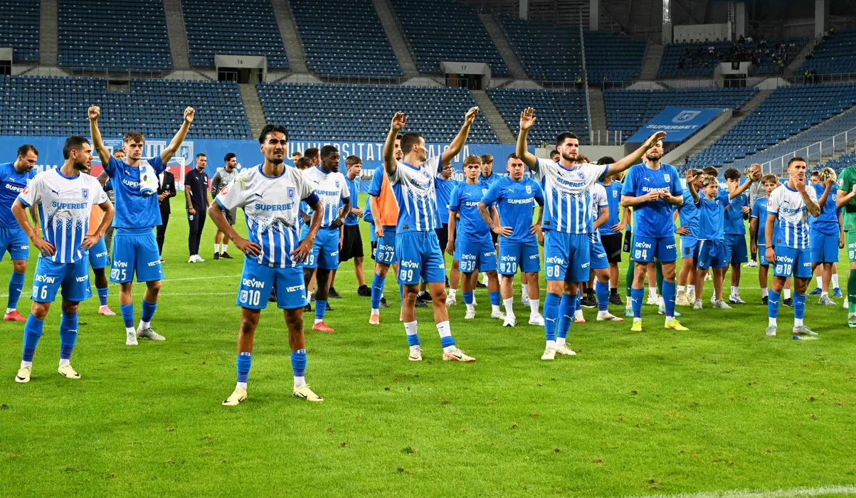 Fotbalistii craioveni Screciu Vladimir Ionuț, Darius Gabriel Falcusan, Stefan Baiaram, Aime Steven Nsasa Nsimba Labe, Assad Al Islam Al Hamlawi, David Matei, Alexandru Cicaldau, Alexandru Cretu si Mihnea Gabriel Radulescu saluta galeria dupa meciul dintre Universitatea Craiova si Universitatea Cluj, contand pentru Superliga Superbet, desfasurat pe Stadionul Ion Oblemenco din Craiova, luni 28 iulie 2025. © FOTO:Razvan Pasarica/SPORT PICTURES