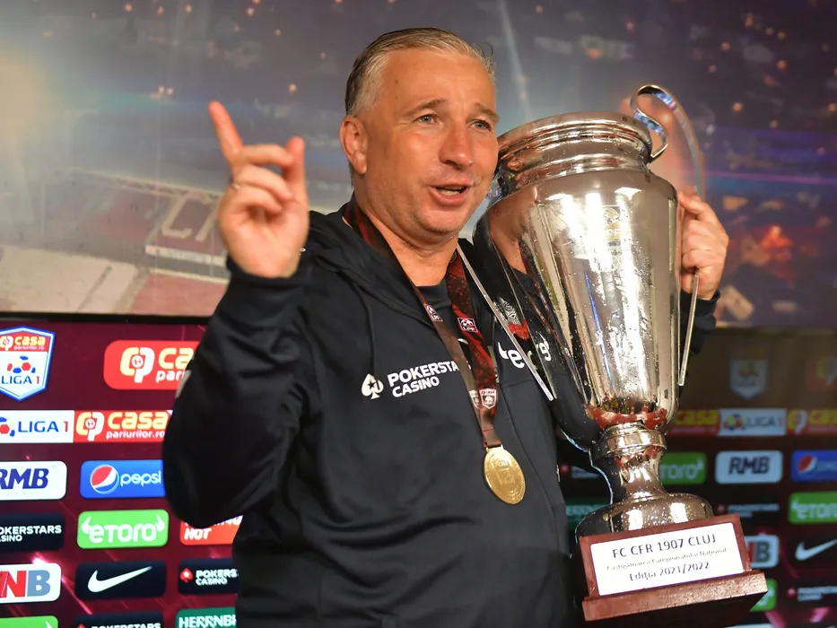 Dan Petrescu se bucura alaturi de trofeu dupa castigarea campionatului in urma meciului de fotbal dintre CFR Cluj si Universitatea Craiova, contand pentru Play-off-ul Ligii 1 Casa Pariurilor, desfasurat pe Stadionul CFR Dr. Constantin Radulescu din Cluj Napoca, duminica 15 mai 2022. © FOTO:Razvan Pasarica/SPORT PICTURES