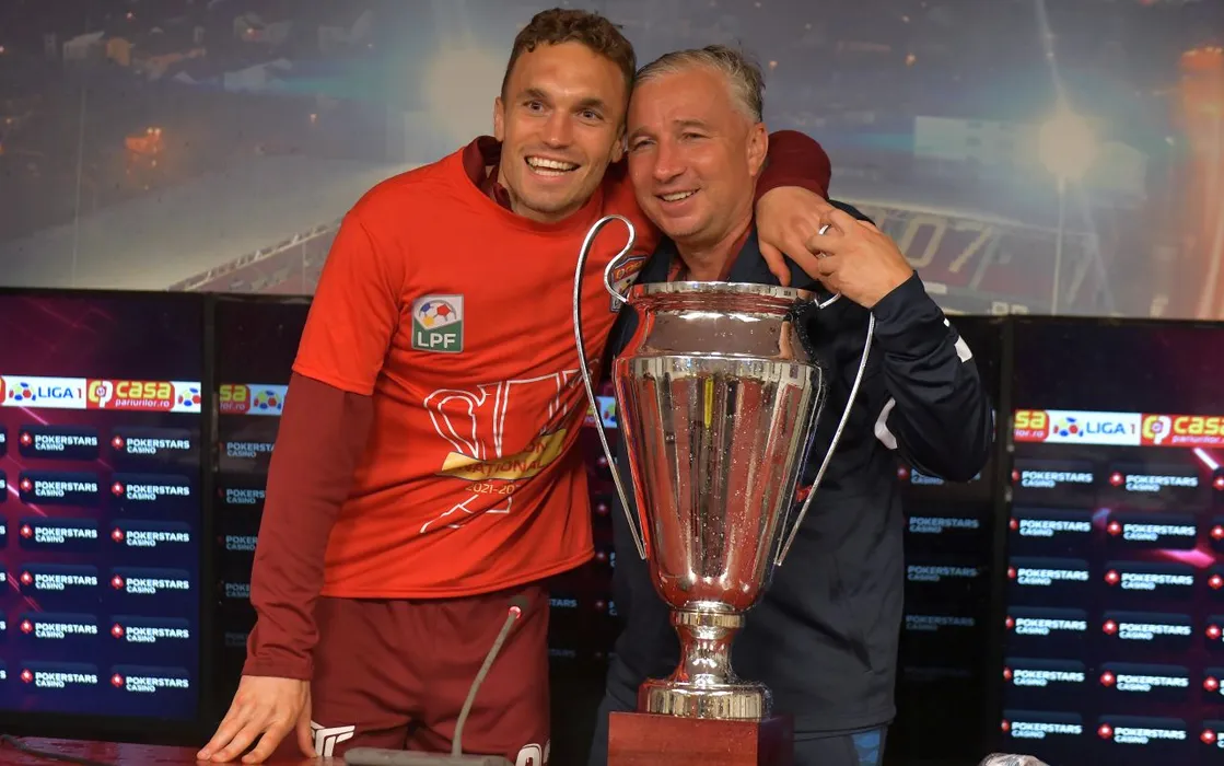 Dan Petrescu pozeaza alaturi de trofeusi Gabriel Debeljuh dupa castigarea campionatului in urma meciului de fotbal dintre CFR Cluj si Universitatea Craiova, contand pentru Play-off-ul Ligii 1 Casa Pariurilor, desfasurat pe Stadionul CFR Dr. Constantin Radulescu din Cluj Napoca, duminica 15 mai 2022. © FOTO:Razvan Pasarica/SPORT PICTURES