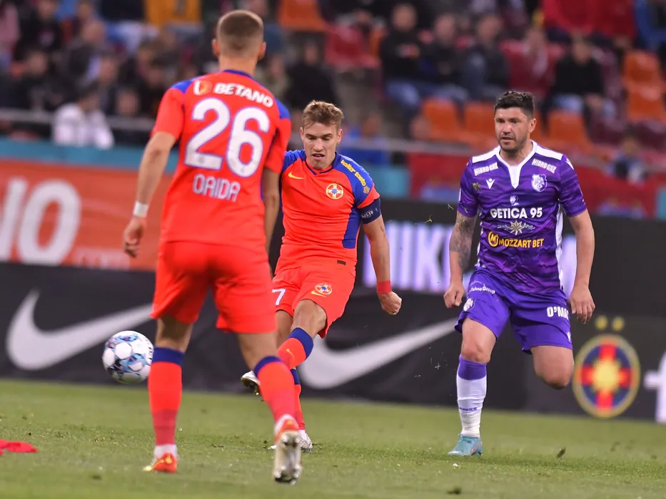 Darius Dumitru Olaru marcheaza un gol de langa Cristian Tanase in meciul de fotbal dintre FCSB si FC Arges, contand pentru Play-off-ul Ligii 1 Casa Pariurilor, desfasurat pe Arena Nationala din Bucuresti, luni 2 mai 2022. © FOTO:Razvan Pasarica/SPORT PICTURES
