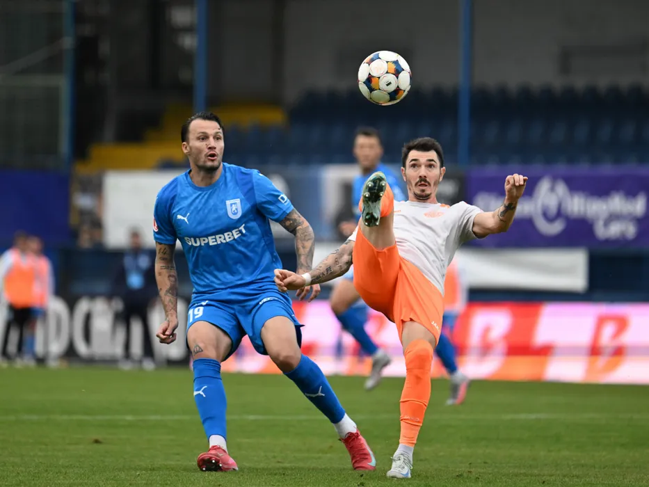 Vasile Mogos si Dragos Ionut Huiban in meciul de fotbal dintre Metaloglobus Bucuresti si Universitatea Craiova, contand pentru Superliga Superbet, desfasurat pe Clinceni Arena din Clinceni, duminica 26 octombrie 2025. © FOTO:Razvan Pasarica/SPORT PICTURES