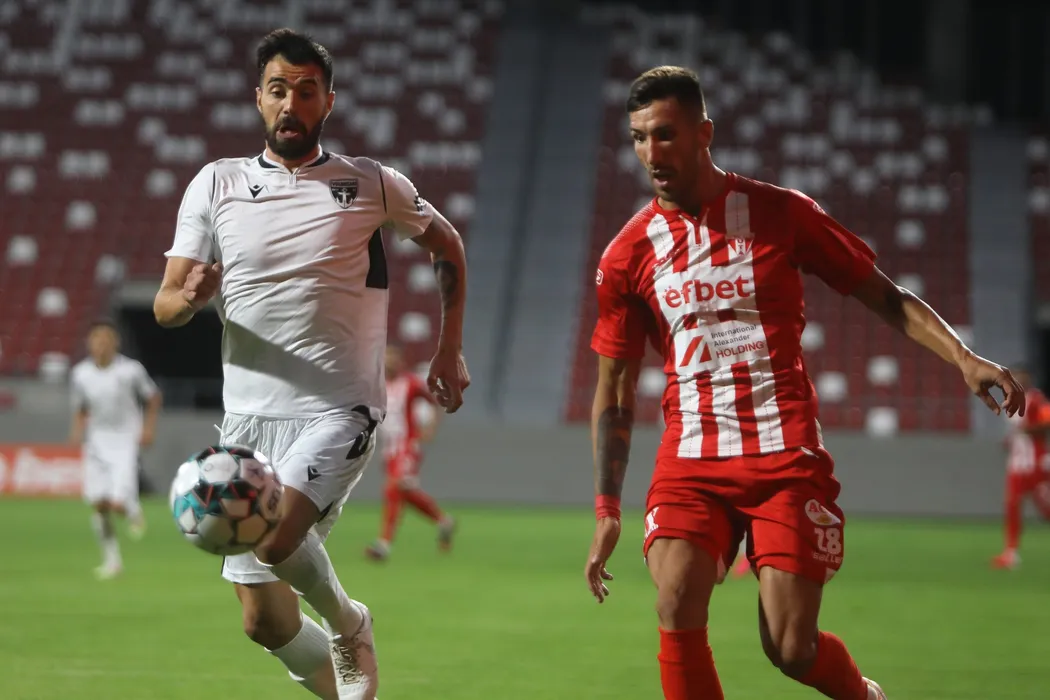 Valentin Buhacianu (D) de la UTA in meciul de fotbal disputat de UTA Arad si FC Voluntari, in etapa a doua din Liga 1, in Arad, vineri, 28 august 2020. Inquam Photos / Ciprian Petcut