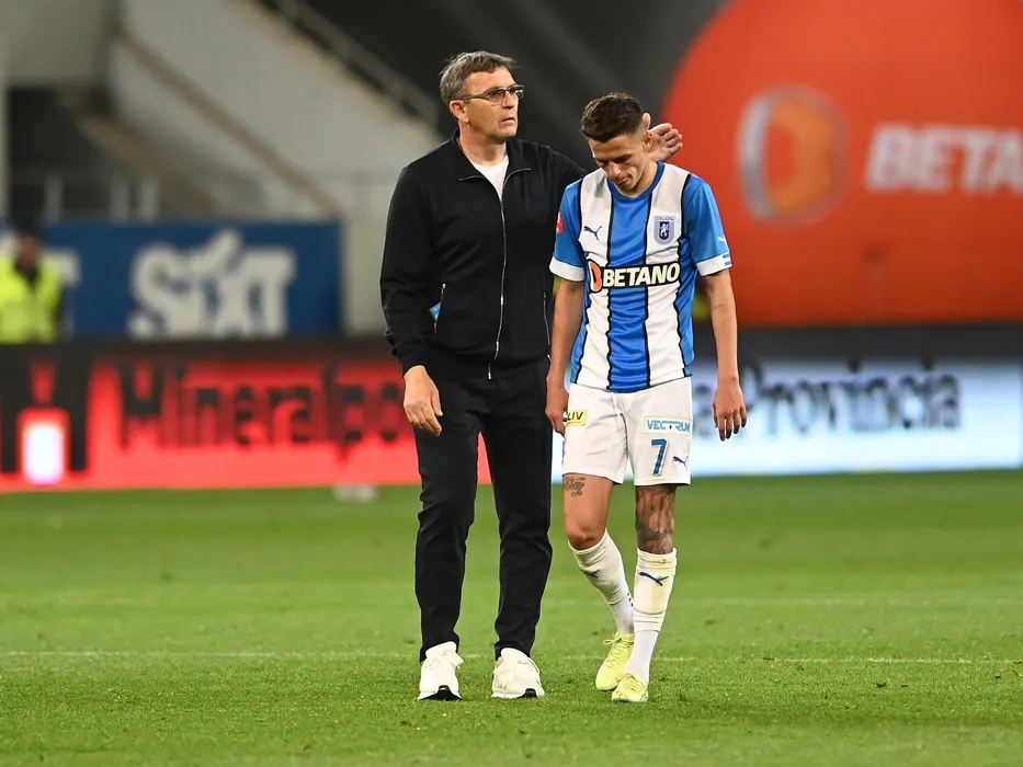 Eugen Neagoe il incurajeaza pe Alexandru George Cimpanu dupa meciul de fotbal dintre Universitatea Craiova si Sepsi OSK Sfantu Gheorghe, contand pentru Play-off-ul Superligii Superbet, desfasurat pe Stadionul Ion Oblemenco din Craiova, duminica 28 mai 2023. © FOTO:Razvan Pasarica/SPORT PICTURES