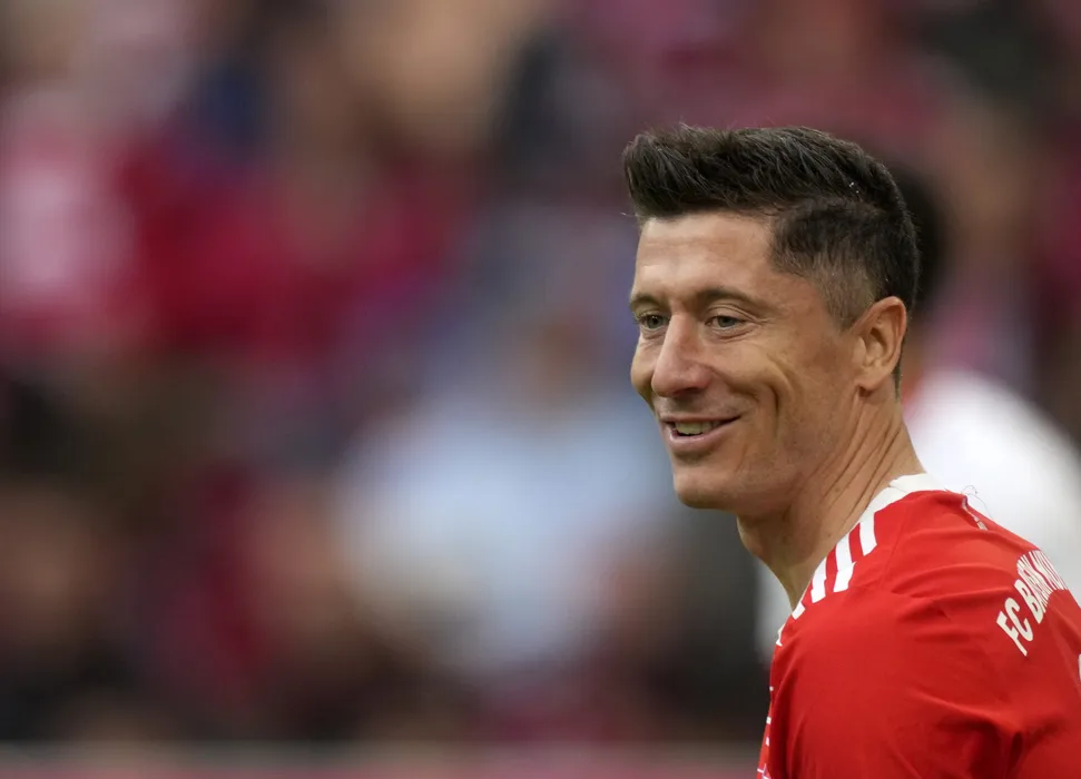 Bayern's Robert Lewandowski smiles during the German Bundesliga soccer match between Bayern Munich and Stuttgart, at the Allianz Arena, in Munich, Germany, Sunday, May 8, 2022. (AP Photo/Michael Probst )