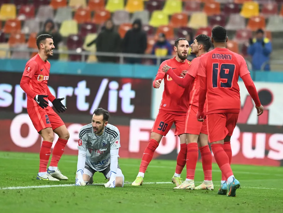 Bucurie a fotbalistilor stelisti dupa un gol marcat cu Razvan Constantin Oaida, Gheorghe Bogdan Rusu si Florinel Teodor Coman spre dezamagirea lui Eduard Adrian Pap in meciul de fotbal dintre FCSB si FC Botosani, contand pentru Superliga Superbet, desfasurat pe Arena Nationala din Bucuresti, luni 19 decembrie 2022. © FOTO:Razvan Pasarica/SPORT PICTURES