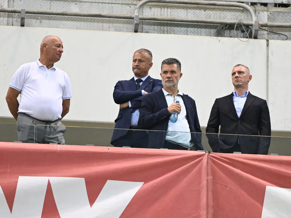 Gheorghita Geolgau, Gabriel Bodescu, Lucian Burchel si Radu Visan in tribuna la meciul amical de fotbal dintre Romania si Canada, desfasurat pe Arena Nationala din Bucuresti, vineri 5 septembrie 2025. © FOTO:Razvan Pasarica/SPORT PICTURES
