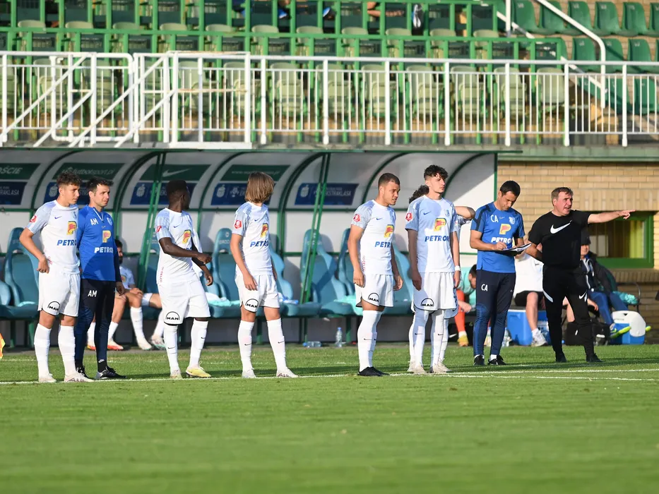 Fotbalistii constanteni Iustin Doicaru, Zorhan Bassong si Nicolas Popescu alaturi de Alexandru Matel, Catalin Cristian Anghel si Gheorghe Hagi la schimbare in meciul amical de fotbal dintre Warta Poznan si Farul Constanta, desfasurat pe Stadionul Warty (Ogrodek) din Poznan, Polonia, duminica 2 iulie 2023. © FOTO:Razvan Pasarica/SPORT PICTURES