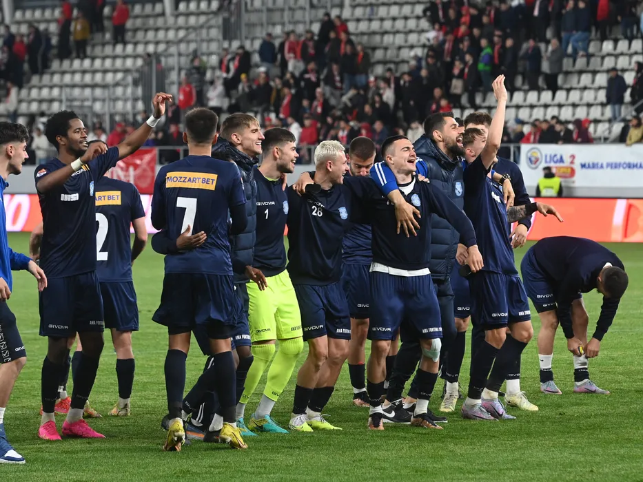 Fotbalistii ieseni Shayon Harrison, Ianos Brinza, Catalin Hlistei si Francisc Cristea saluta galeria dupa meciul de fotbal dintre Dinamo Bucuresti si Politehnica Iasi, contand pentru Play-off-ul Ligii a-2-a, desfasurat pe Stadionul National Arcul de Triumf din Bucuresti, marti 25 aprilie 2023. © FOTO:Razvan Pasarica/SPORT PICTURES