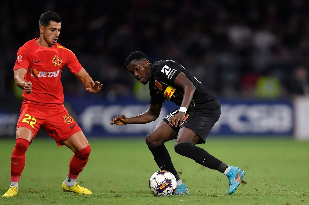 FC Nordsjaelland Ernest Nuamah Appiah and Valentin Gheorghe in action during the UEFA Europa Conference League Third Qualifying Round First Leg match between FCSB and FC Nordsjaelland at Ghencea Stadium, in Bucharest, Romania on August 10, 2023.