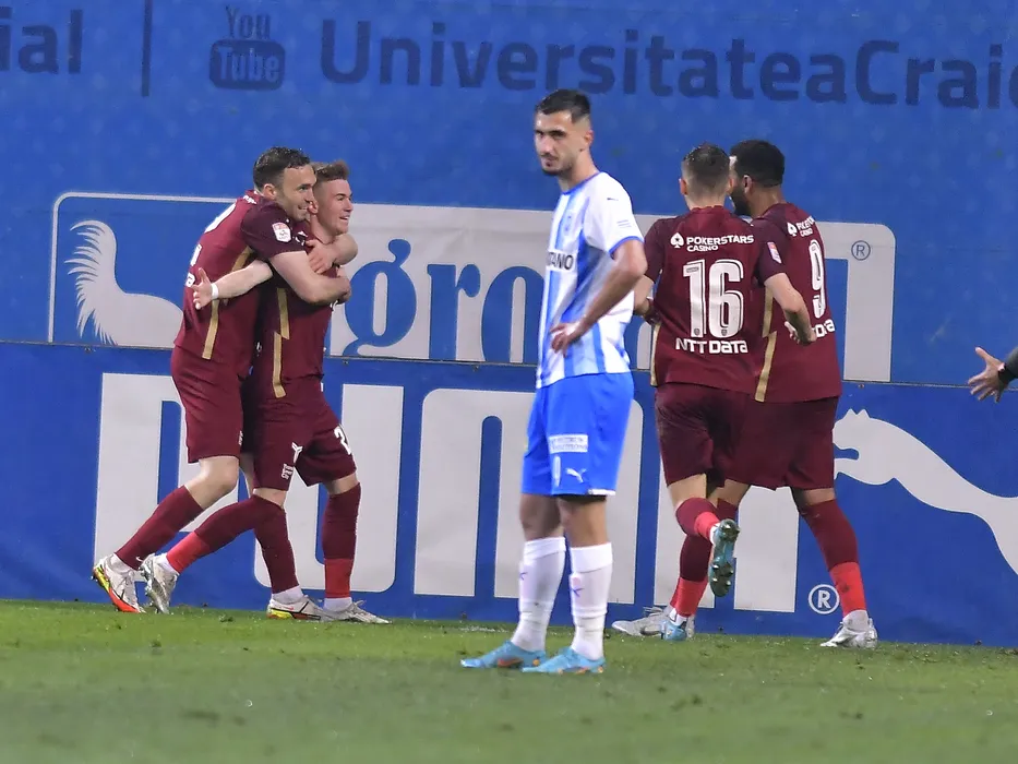 Bucurie a fotbalistilor clujeni dupa un gol marcat cu Gabriel Debeljuh si Claudiu Adrian Mihai Petrila in meciul de fotbal dintre Universitatea Craiova si CFR Cluj, contand pentru Play-off-ul Ligii 1 Casa Pariurilor, desfasurat pe Stadionul Ion Oblemenco din Craiova, duminica 10 aprilie 2022. © FOTO:Razvan Pasarica/SPORT PICTURES