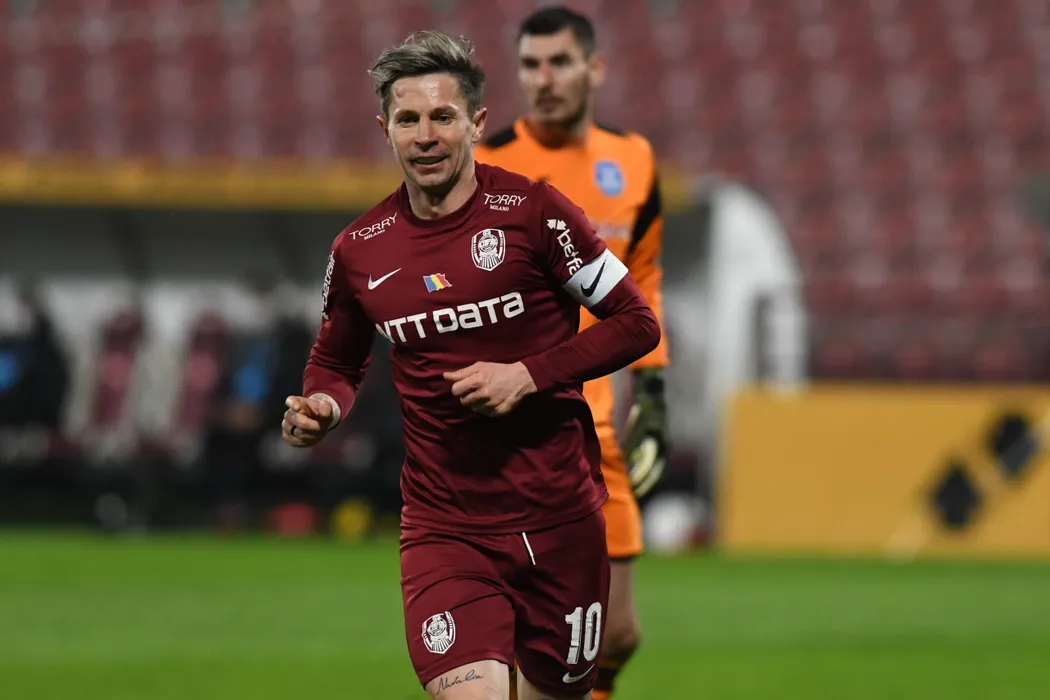 Ciprian Deac, de la CFR Cluj, reactioneaza dupa ce a inscris un gol in timpul meciului de fotbal contra echipei CSM Politehnica Iasi din etapa a XXVII-a a Ligii 1, disputat pe stadionul Dr. Constantin Rădulescu din Cluj-Napoca, duminica, 14 martie 2021. FLAVIU BUBOI / MEDIAFAX FOTO