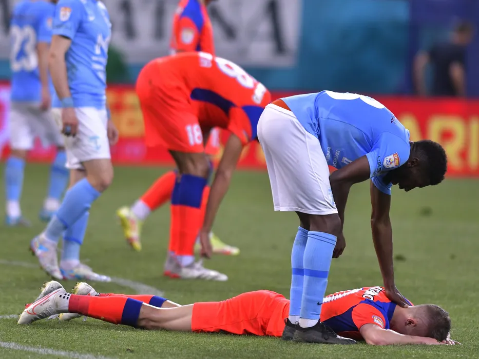 Helder Luis Lopes Vieira Tavares il consoleaza pe Florin Lucian Tanase aflat la pamant dupa meciul de fotbal dintre FC Voluntari si FCSB, contand pentru Play-off-ul Ligii 1 Casa Pariurilor, desfasurat pe Arena Nationala din Bucuresti, sambata 14 mai 2022. © FOTO:Razvan Pasarica/SPORT PICTURES