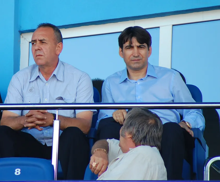 Fostul selectioner al nationalei, Victor Piturca, discuta cu Gabi Boldici, in timpul partidei Universitatea Craiova - Pandurii Targu Jiu, in timpul meciului U Craiova - Pandurii Targu Jiu, din etapa a III-a a Ligii I, in Craiova, duminica, 16 august 2009. BOGDAN DANESCU / MEDIAFAX FOTO