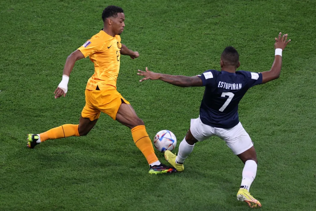 Netherlands' defender #02 Jurrien Timber (L) and Ecuador's defender #07 Pervis Estupinan fights for the ball during the Qatar 2022 World Cup Group A football match between the Netherlands and Ecuador at the Khalifa International Stadium in Doha on November 25, 2022.,Image: 740176773, License: Rights-managed, Restrictions: , Model Release: no