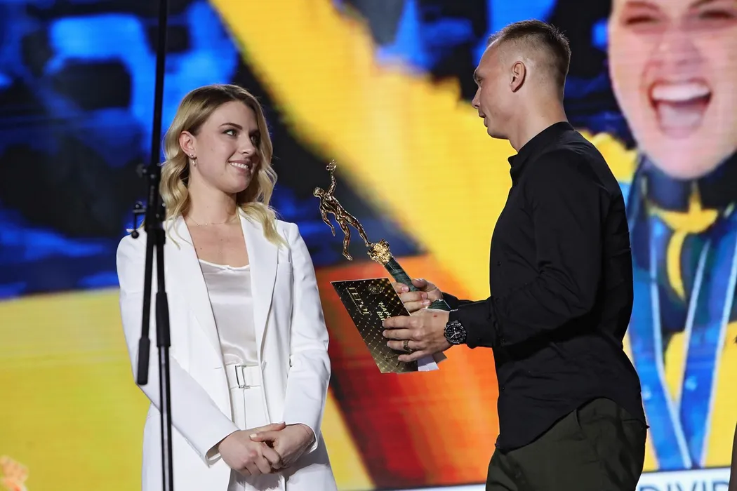 KYIV, UKRAINE - MARCH 9, 2020 - Bronze medallist of 2012 and 2016 Summer Olympics, Ukrainian fencer Olga Kharlan (L) accepts the People's Choice award from Olympic gold medalist freestyle skier Oleksandr Abramenko during the Heroes of Sports Year 2019 award ceremony in Kyiv, capital of Ukraine.,Image: 505114000, License: Rights-managed, Restrictions: WORLD RIGHTS, Model Release: no, Credit line: Profimedia