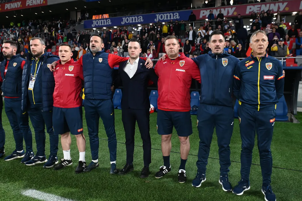 Staff-ul roman cu Razvan Stanca, Valentin Nastase, Razvan Rotaru si Emil Sandoi la meciul amical de fotbal dintre Romania U21 si Portugalia U21, desfasurat pe Stadionul Steaua din Bucuresti, vineri 24 martie 2023. © FOTO:Razvan Pasarica/SPORT PICTURES