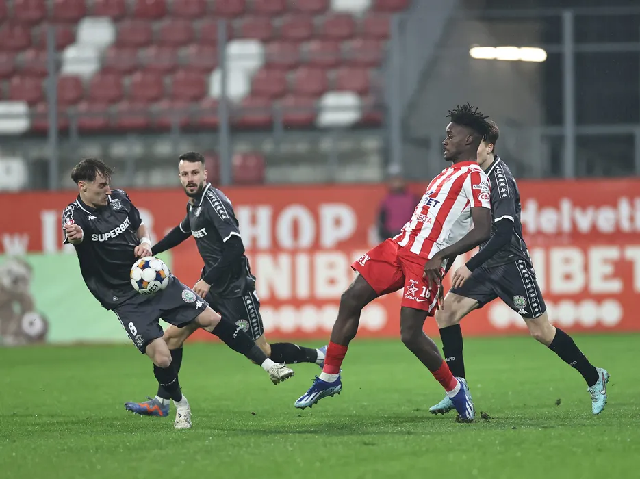 Richard Odada si Constantin Grameni, Jakub Hromada in meciul de fotbal dintre UTA Arad si FC Rapid Bucuresti, contand pentru Superliga Superbet, desfasurat pe Arena Francisc Neuman din Arad, luni 26 ianuarie 2026. © FOTO:Sebastian Tataru/SPORT PICTURES