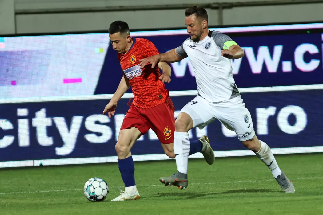 Olimpiu Morutan (S), de la FCSB, lupta pentru balon cu Razvan Patriche(D), de la Academica Clinceni, in meciul de fotbal din etapa 7 a play-off-ului Ligii 1, disputat pe stadionul Marin Anastasovici din Giurgiu, luni, 10 mai 2021. GEORGE FILIP / MEDIAFAX FOTO