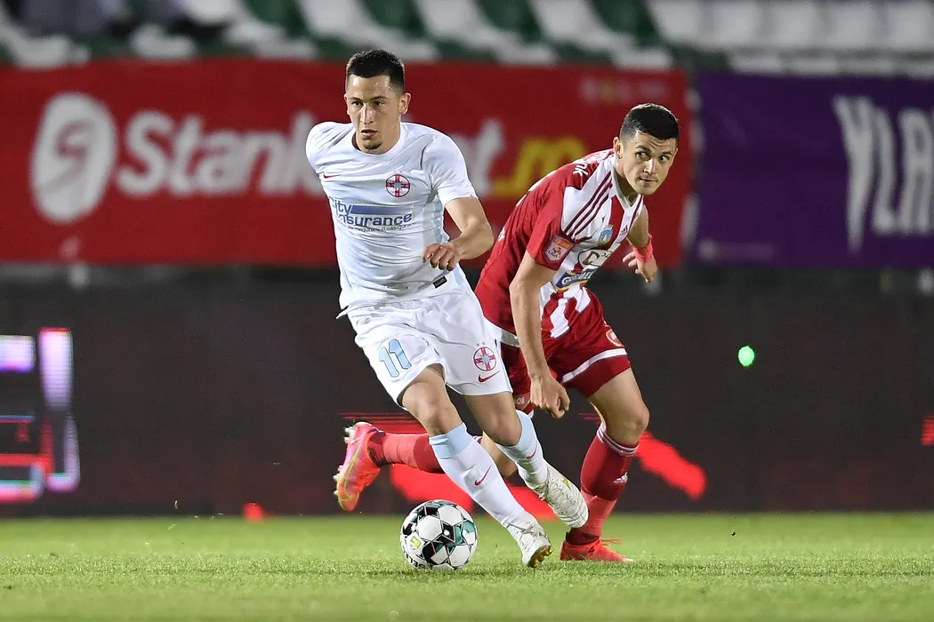 Olimpiu Morutan (S), de la FCSB, suteaza in timpul meciului de fotbal contra echipei Sepsi OSK din etapa 8 a play-off-ului Ligii 1, disputat pe stadionul Municipal din Sfantu Gheorghe, duminica, 16 mai 2021. ALEX NICODIM / MEDIAFAX FOTO