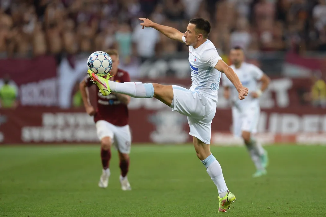 Olimpiu Morutan, de la FCSB, suteaza in timpul meciului de fotbal contra echipei Rapid ddin etapa a V-a a Ligii 1, disputat pe stadionul Giulesti - Valentin Stanescu din Bucuresti, sambata, 15 august 2021. EDUARD VINATORU / MEDIAFAX FOTO