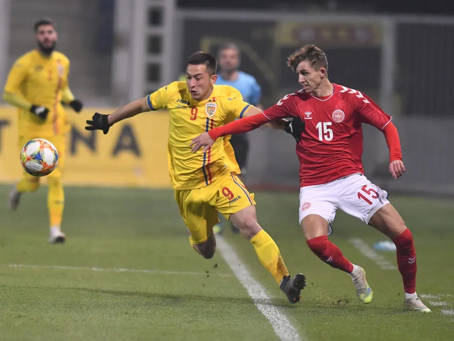 Olimpiu Morutan si Jesper Lindstrom in meciul de fotbal dintre Romania U21 si Danemarca U21, din cadrul Preliminariilor Campionatului European din 2021, desfasurat fara spectatori pe Stadionul Ilie Oana din Ploiesti, marti 17 noiembrie 2020. © FOTO:Razvan Pasarica/SPORT PICTURES