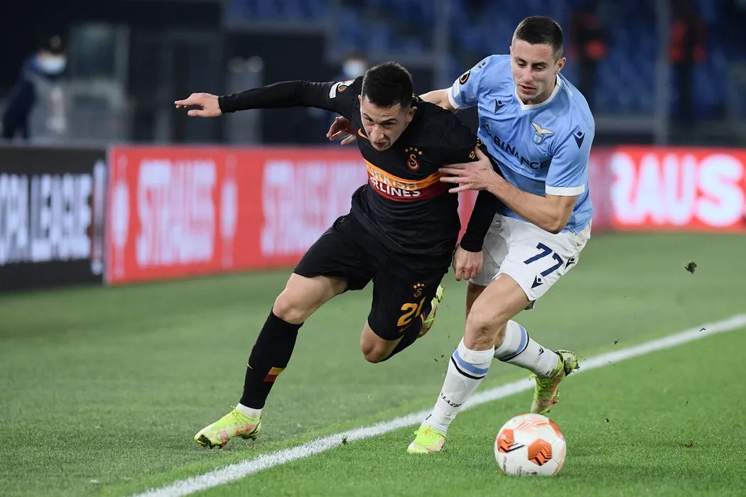 Lazio's Montenegrin midfielder Adam Marusic (R) holds back Galatasaray's Romanian midfielder Olimpiu Morutan during the UEFA Europa League Group E football match between Lazio and Galatasaray on December 9, 2021 at the Olympic stadium in Rome.,Image: 647196906, License: Rights-managed, Restrictions: , Model Release: no, Credit line: Profimedia