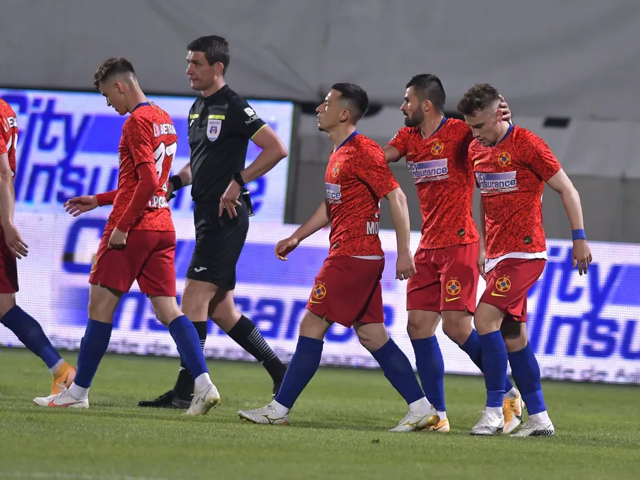 Darius Dumitru Olaru este felicitat de Octavian George Popescu, Olimpiu Vasile Morutan si Valentin Cretu dupa un gol marcat in meciul de fotbal dintre FCSB si Academica Clinceni, contand pentru Play-off-ul Ligii 1 Casa Pariurilor, desfasurat fara spectatori pe Stadionul Marin Anastasovici din Giurgiu, luni 10 mai 2021. © FOTO:Razvan Pasarica/SPORT PICTURES