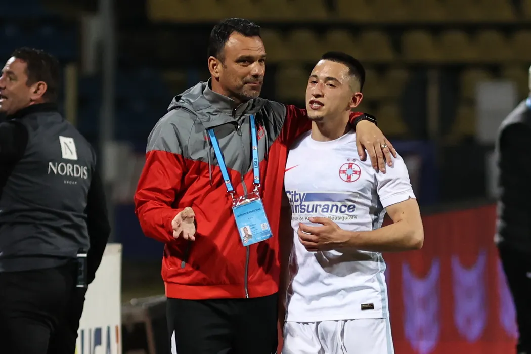 Anton Petrea (S), antrenorul echipei FCSB, si Olimpiu Morutan (D) reactioneaza la finalul meciului de fotbal contra formatiei Academica Clinceni din etapa a doua a play-off-ului Ligii 1, disputat pe stadionul Ion Comsa din Calarasi, joi, 22 aprilie 2021. GEORGE FILIP / MEDIAFAX FOTO