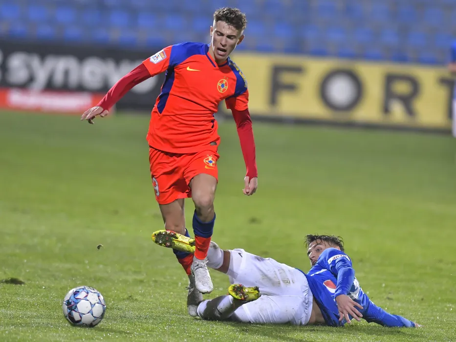 Octavian George Popescu si George Danut Ganea in meciul de fotbal dintre Farul Constanta si FCSB, contand pentru Liga 1 Casa Pariurilor, desfasurat pe Stadionul central al Academiei Gheorghe Hagi din Ovidiu, joi 4 noiembrie 2021. © FOTO:Razvan Pasarica/SPORT PICTURES