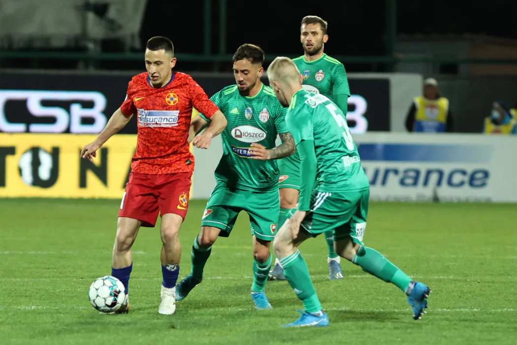Olimpiu Morutan (S), de la FCSB, suteaza in timpul meciului de fotbal contra echipei Sepsi OSK din etapa 3 a play-off-ului Ligii 1, disputat pe stadionul Marin Anastasovici din Giurgiu, duminica, 25 aprilie 2021. GEORGE FILIP / MEDIAFAX FOTO