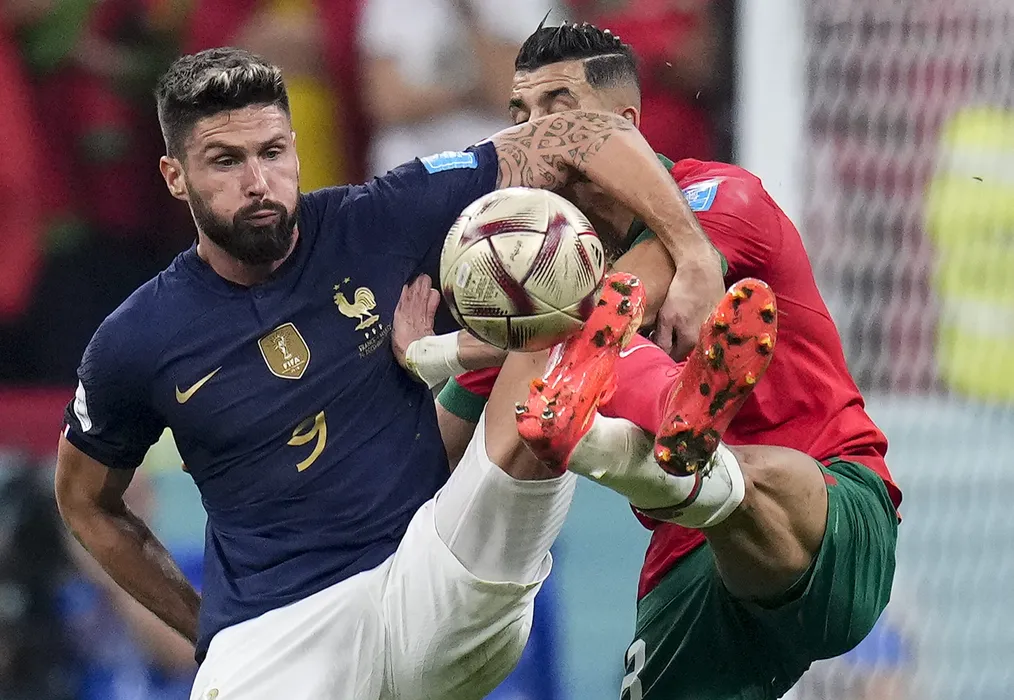France's Olivier Giroud and Morocco's Noussair Mazraoui, right, vie for the ball during the World Cup semifinal soccer match between France and Morocco at the Al Bayt Stadium in Al Khor, Qatar, Wednesday, Dec. 14, 2022. (AP Photo/Manu Fernandez)