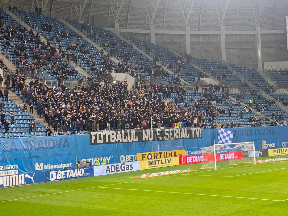 Oltenii au făcut spectacol la revenirea pe stadion! Torțe, fumigene și mesaje cu direcție, la meciul cu FCSB: „Fotbalul nu e serial TV!” | FOTO & VIDEO