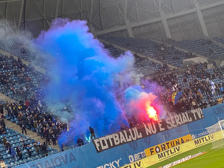 Oltenii au făcut spectacol la revenirea pe stadion! Torțe, fumigene și mesaje cu direcție, la meciul cu FCSB: „Fotbalul nu e serial TV!” | FOTO & VIDEO