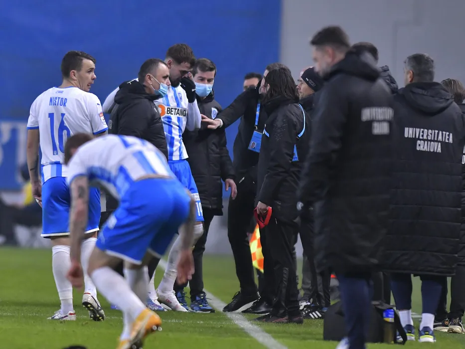 Elvir Koljic paraseste terenul accidentat sub privirea lui Dan Nicolae Nistor in meciul de fotbal dintre Universitatea Craiova si UTA Arad, contand pentru Liga 1 Casa Pariurilor, desfasurat pe Stadionul Ion Oblemenco din Craiova, marti 14 decembrie 2021. © FOTO:Razvan Pasarica/SPORT PICTURES