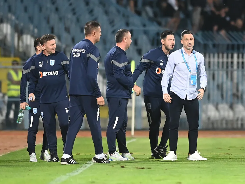 Mirel Radoi alaturi de staff-ul sau la meciul de fotbal dintre Universitatea Craiova si Farul Constanta, contand pentru Superliga Superbet, desfasurat pe Stadionul Municipal din Drobeta Turnu Severin, luni 5 septembrie 2022. © FOTO:Razvan Pasarica/SPORT PICTURES