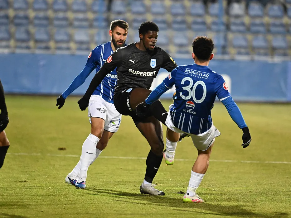Bogdan Ionut Tiru si Aime Steven Nsasa Nsimba Labe in meciul de fotbal dintre Farul Constanta si Universitatea Craiova, contand pentru Superliga Superbet, desfasurat pe Stadionul central al Academiei Gheorghe Hagi din Ovidiu, duminica 1 februarie 2026. © FOTO:Razvan Pasarica/SPORT PICTURES