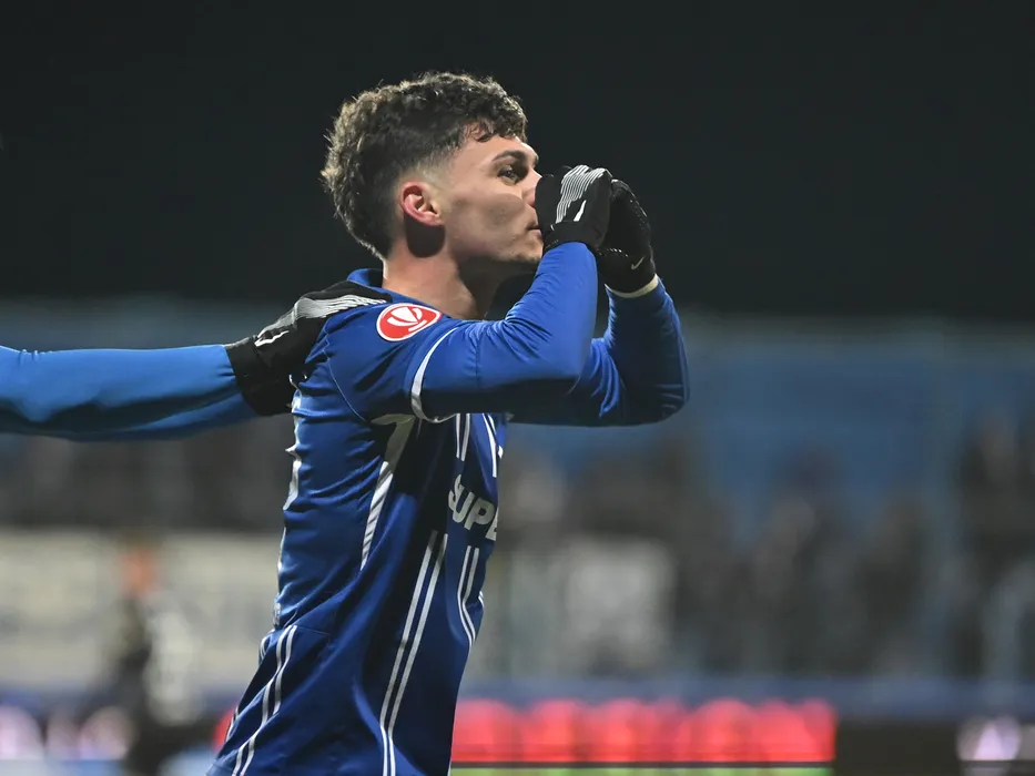 David Iulian Maftei se bucură dupa un gol marcat in meciul de fotbal dintre Farul Constanta si Universitatea Craiova, contand pentru Superliga Superbet, desfasurat pe Stadionul central al Academiei Gheorghe Hagi din Ovidiu, duminica 1 februarie 2026. © FOTO:Razvan Pasarica/SPORT PICTURES