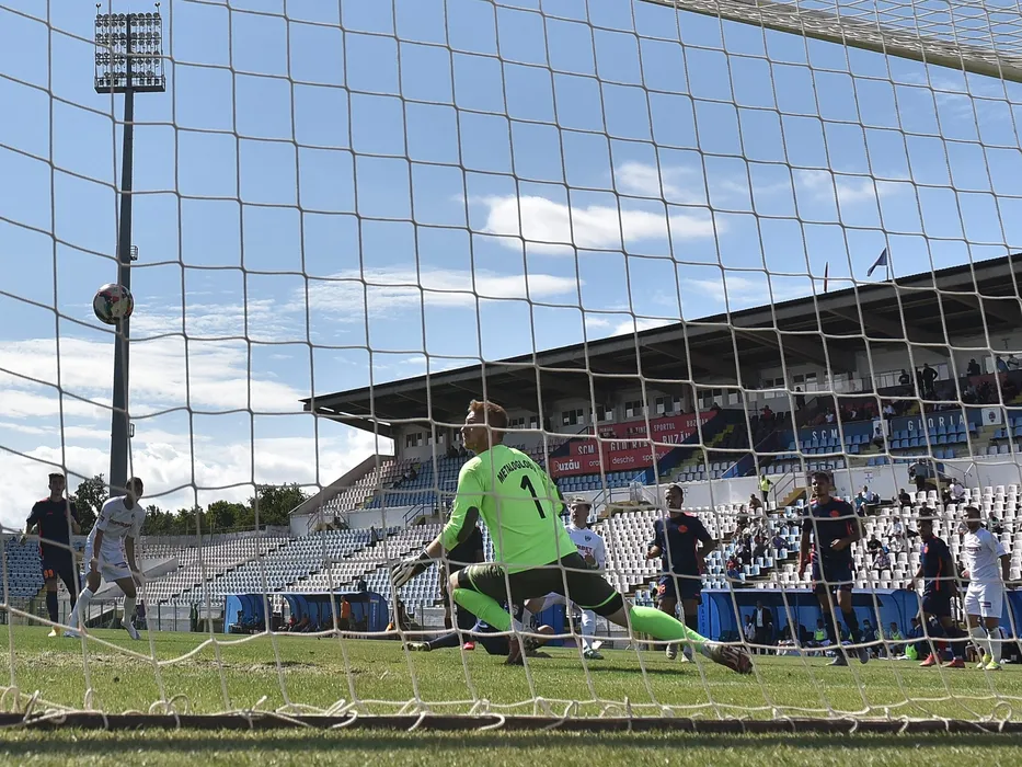 Alexandru Neacșu marcheaza un gol in poarta lui George Gavrilas in meciul de fotbal dintre FC Buzau si Metaloglobus Bucuresti, contand pentru Liga a-2-a Casa Pariurilor, disputat pe Stadionul Gloria din Buzau, sambata 18 septembrie 2021. © FOTO:Razvan Pasarica/SPORT PICTURES
