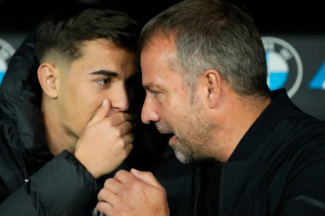 Hansi Flick head coach of Barcelona and Gavi central midfield of Barcelona and Spain talks during the La Liga match between Real Madrid CF and FC Barcelona at Estadio Santiago Bernabeu on October 27, 2024 in Madrid, Spain. (Photo by Jose Breton/Pics Action/NurPhoto via Getty Images)